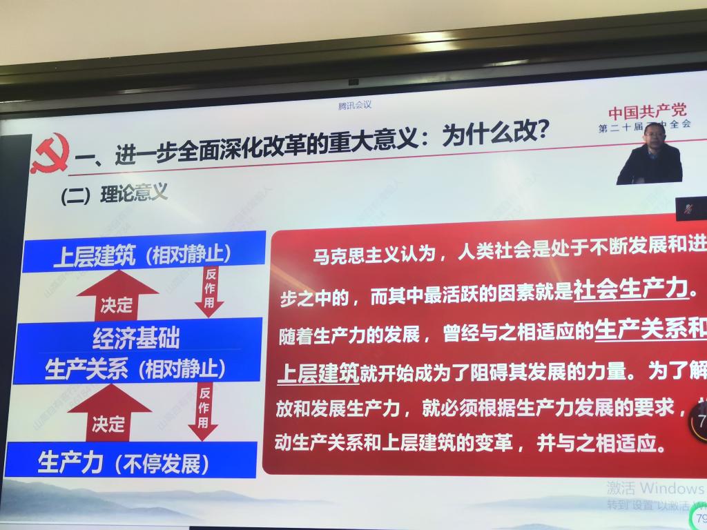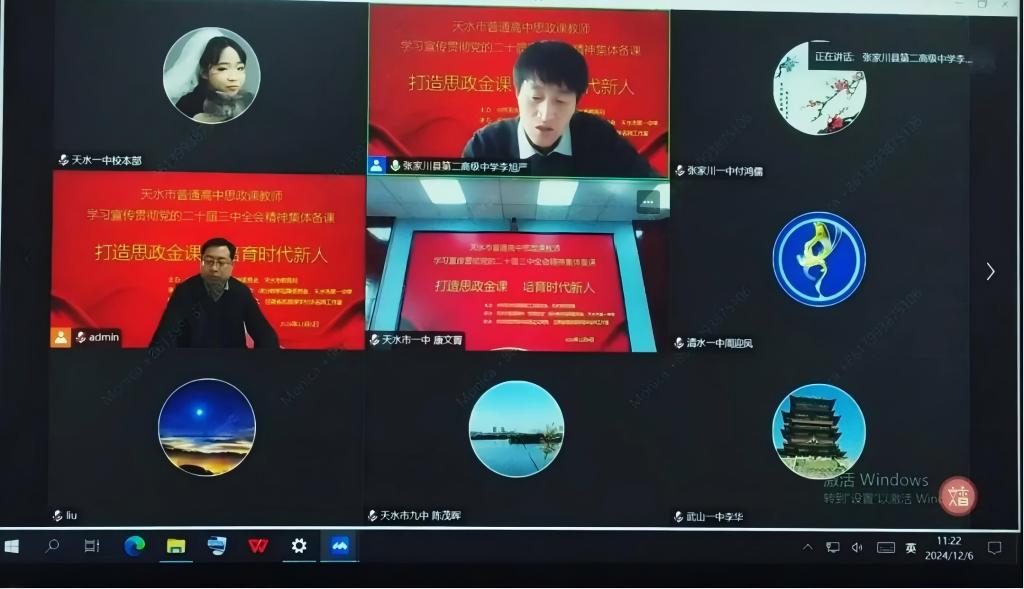 为深入学习宣传贯彻党的二十届三中全会精神,全面落实全国教育大会精神,推进天水市大中小学思政课一体化建设,12月6日上午,天水市普通高中思想政治课教师开展了学习宣传贯彻党的二十届三中全会精神集体备课会。会议由中共天水市委教育工作委员会、天水市教育局主办,天水市普通高中“思想政治”课分教学指导委员会、天水市第一中学承办,天水师范学院澳门网投唯一官网与甘肃省思政课李旭华名师工作室协办,会议由天水市普通高中“思想政治”课分教学指导委员会主任、天水市一中副校长宋劼主持。会议主题是“打造思政金课,培育时代新人”,采用腾讯会议在线直播形式进行,天水市第一中学思政课教师线下参会,其他学校设立分会场组织思政课教师线上线下结合参会,全市共计三百余名普通高中思政课教师参会。