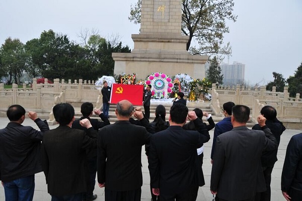 4月4日早上8:50,参加活动的党员同志准时在革命烈士纪念碑前集合,党员同志们排着整齐的队伍向革命先烈鞠躬默哀寄托哀思。在庄严肃穆的气氛中,首先,支部委员代表机关一支部向烈士敬献了花圈,表达对革命烈士的深切缅怀之情。随后,伴随着雄壮的义勇军进行曲,支部书记邹厚亏带领全体党员重温入党誓词。接着,支部委员先后带领党员同志们学习了“党章”“习近平总书记关于国家安全观的系列重要论述”“中央、省委和市委关于扫黑除恶专项斗争重要批示指示精神”“中共中央关于加强党的政治建设的意见”“2019年湖北高校党的建设和思想政治工作要点”“党风廉政教育‘以案明纪说法’”。最后,支部书记邹厚亏作了总结讲话,他强调全体党员一要不忘初心、坚定信仰,二要加强修养、提升本领,三要勇于担当、争创佳绩。同时,他号召全体党员要始终保持对传统的敬畏与尊重、对先烈的缅怀与感恩,承继先烈之遗志,脚踏实地、真抓实干、锐意进取、改革创新,为把随职建设成全国知名、全省一流的高职院校,实现三步走“随职梦”,以及建设品质随州贡献自己应有的力量。