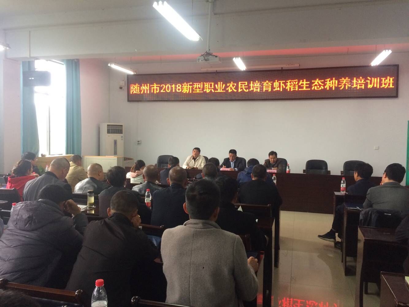 4月9日下午,随州市2018新型职业农民培育虾稻生态种养生产经营型管理人员培训班在我院举行开班仪式,来自全市从事虾稻种养业的65名农民兄弟将接受为期两周的系统专业学习培训,这是我院继今年年初成功承办全市农技人员知识更新培训后又一重要社会培训。该项目为政府公开招标采购项目,我院经过公开答辩,赢得评标专家的青睐和竞争对手的信服,并最终在2019年初成功中标。