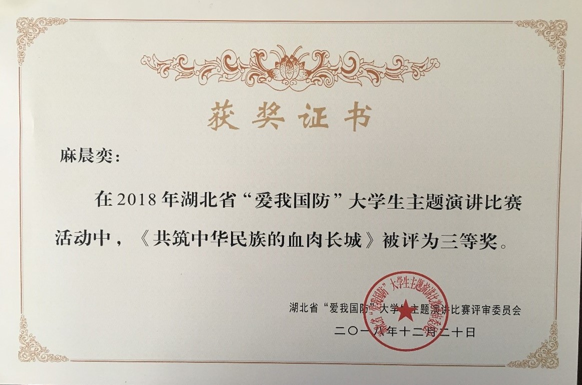 近日,湖北省“爱我国防”大学生主题演讲比赛评审委员会公布评审结果,bat365推荐的医护学院麻晨奕同学荣获三等奖。