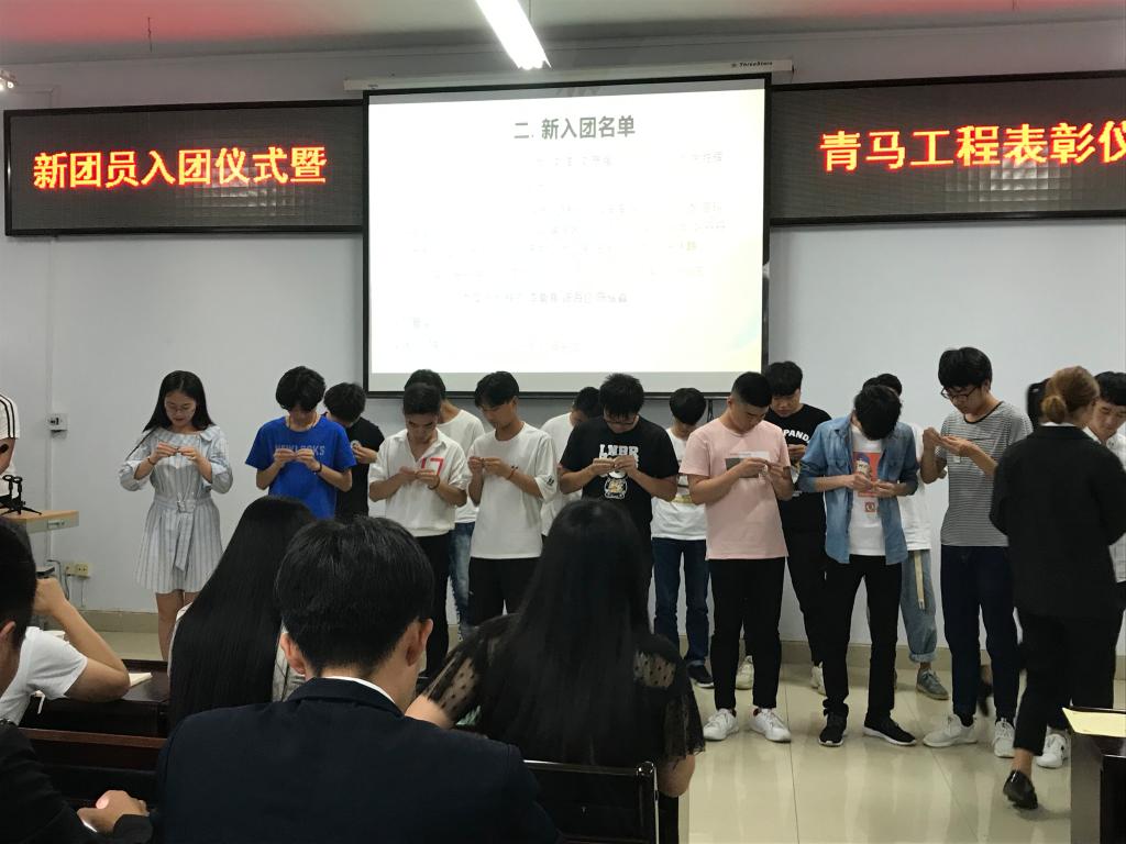 大会在主持人有条不紊地主持下,一项接着一项有序进行:奏唱国歌、宣布新团员入团名单、院团委书记发言、宣誓、新团员代表发言、为新团员佩戴团徽、青马班颁奖、奏唱团歌。