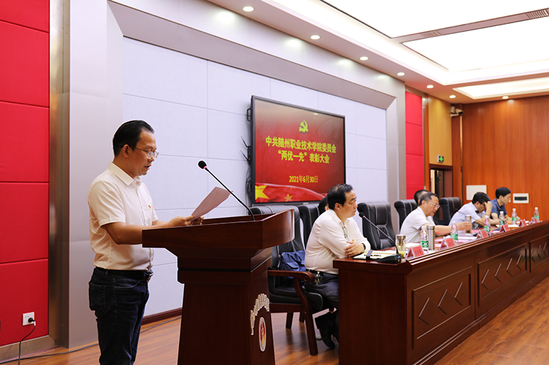 党委书记李德荣作重要讲话。首先,他代表学校向受表彰的先进集体和优秀个人表示热烈祝贺。在讲话中,他带领全体教职工党员回顾了中国共产党一百年以来的光辉历程,动员和激励全体党员干部和师生弘扬坚持真理、坚守理想,践行初心、担当使命,对党忠诚、不负人民的伟大建党精神。