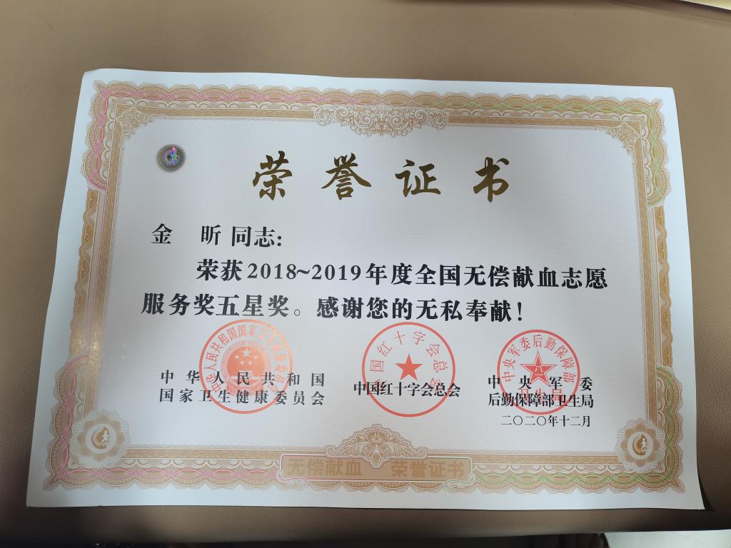 同时,金昕还是一名“三献”志愿者,2017年5月,金昕在父母的支持和见证下签署了遗体器官眼角膜捐献登记表;2017年12月第一次献血时,她加入了中华骨髓库。她还积极参加协会组织的献血、助学、敬老、扶贫和“三献”志愿服务等各类公益活动。2020年,新冠肺炎疫情爆发,湖北省血小板库存告急,金昕一方面组织同学们向疫情最严重的武汉市捐款捐物。在疫情得到控制,武汉市解封后,金昕又是第一批前往武汉市的无偿献血志愿者,并先后4次为当地无偿捐献血小板,共计8个治疗量。