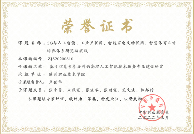 近日,从中华职业教育社传来喜讯:由bat365卢世华老师主持的中华职教社课题《基于信息素养提升的高职人工智能技术服务专业建设研究》(课题编号:ZJS20200810),经中华职教社课题评审委员会评审顺利结题,并荣获三等奖,实现了bat365国家级研究课题结题并获奖的新突破,为学校争得了荣誉。