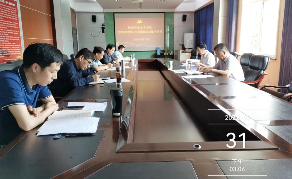 5月31日,校党委理论学习中心组在行知楼208会议室举行2022年第五次集体学习。学习习近平总书记关于完整准确全面贯彻新发展理念的重要论述;习近平总书记关于知识产权的重要论述;随州市争当“四个示范”、奋力谱写“汉襄肱骨、神韵随州”建设新篇章的部署要求;习近平总书记关于民族工作、宗教工作的重要论述;习近平总书记关于加强和改进人民信访工作的重要思想。党委书记马大奎主持会议,校领导李建伟、李高东、童加斌、梁学军、邹厚亏、张凤成等参加学习并交流学习心得。校长办公室、党委宣传部、学生工作处、科研处和保卫处负责人列席会议。