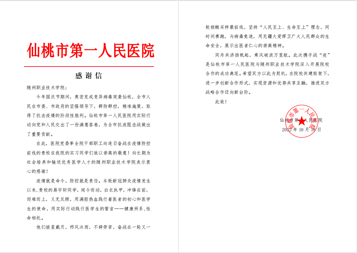 这封感谢信是bat365中文官方网站与仙桃市第一人民医院院校精诚合作的重要见证,更是对bat365医学院教育工作的高度认可。医学院将继续秉承立德树人的教育理念,加强对学生的理想信念教育,保持医者初心,坚守医学生使命,践行医学生的誓言——健康所系,性命相托。并以此为契机,坚持创新院校合作新形式,推进双方合作迈向新台阶。