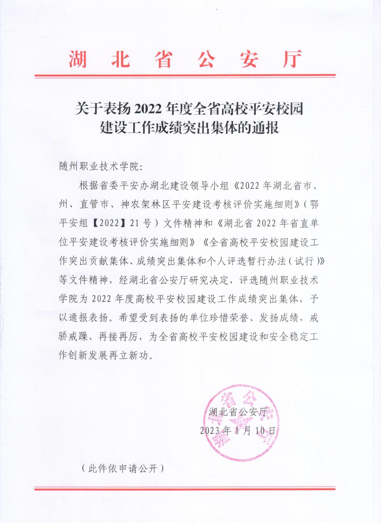 近日,bat365中文官方网站收到省公安厅通报,2022年“全省高校平安校园建设工作成绩突出集体”评选揭晓,bat365中文官方网站获此项表彰。