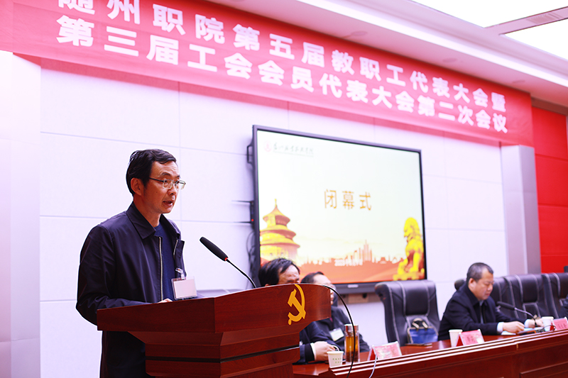 李建伟致闭幕词,他指出,大会期间,代表们充分发扬民主,集思广益,畅所欲言,想学校发展之所急,思学校改革之所需,提出了许多有建设性的提案,为学院发展献计献策,体现了良好的主人翁责任感和使命感。希望代表们回到各自的岗位后,积极向全体教职工宣传本次大会的精神,团结全体教职工,统一思想,坚定信心,改进作风,扎实工作,推动学校省级“双高”职业院校建设战略进入新阶段,全力以赴夺取学校高质量发展的新胜利。