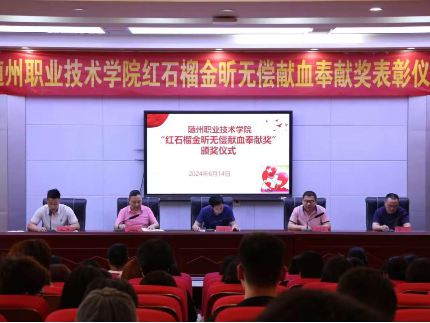 6月14日,第一届“红石榴·金昕无偿献血奉献奖”颁奖仪式在bat365学术报告厅举行。学校党委委员、副校长邹厚亏,市中心血站副站长吴大奎,学生工作处处长钟守兵,护理学院院长何宁,团委社团管理科科长陈赛,以及各二级学院党总支副书记、学工办主任、团总支书记,受表彰的学生及无课师生代表参加了此次表彰活动。