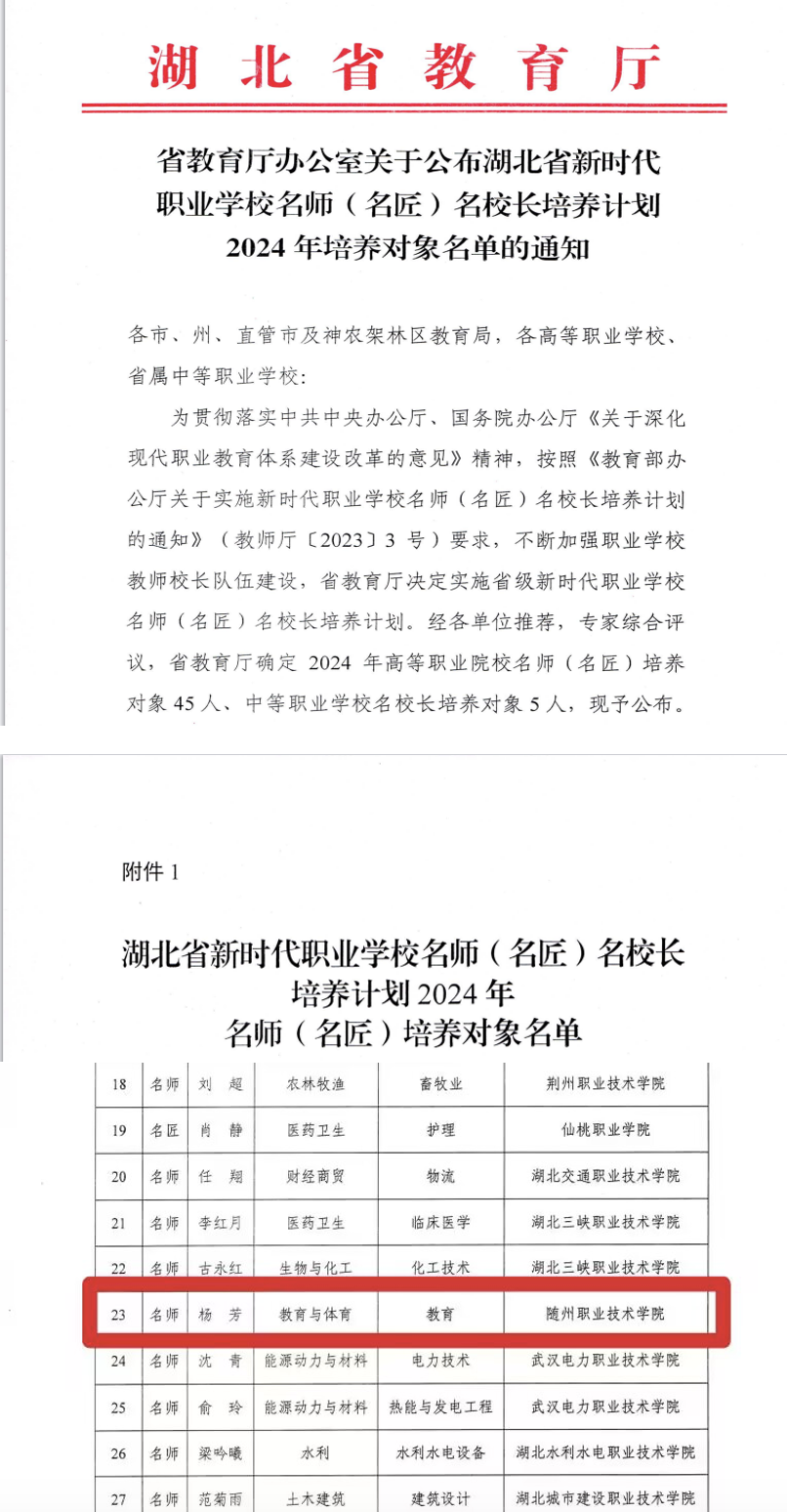 7月5日,省教育厅公布了湖北省新时代职业学校名师(名匠)名校长培养计划2024年培养对象名单,bat365教师杨芳入选教育类名师培养对象。