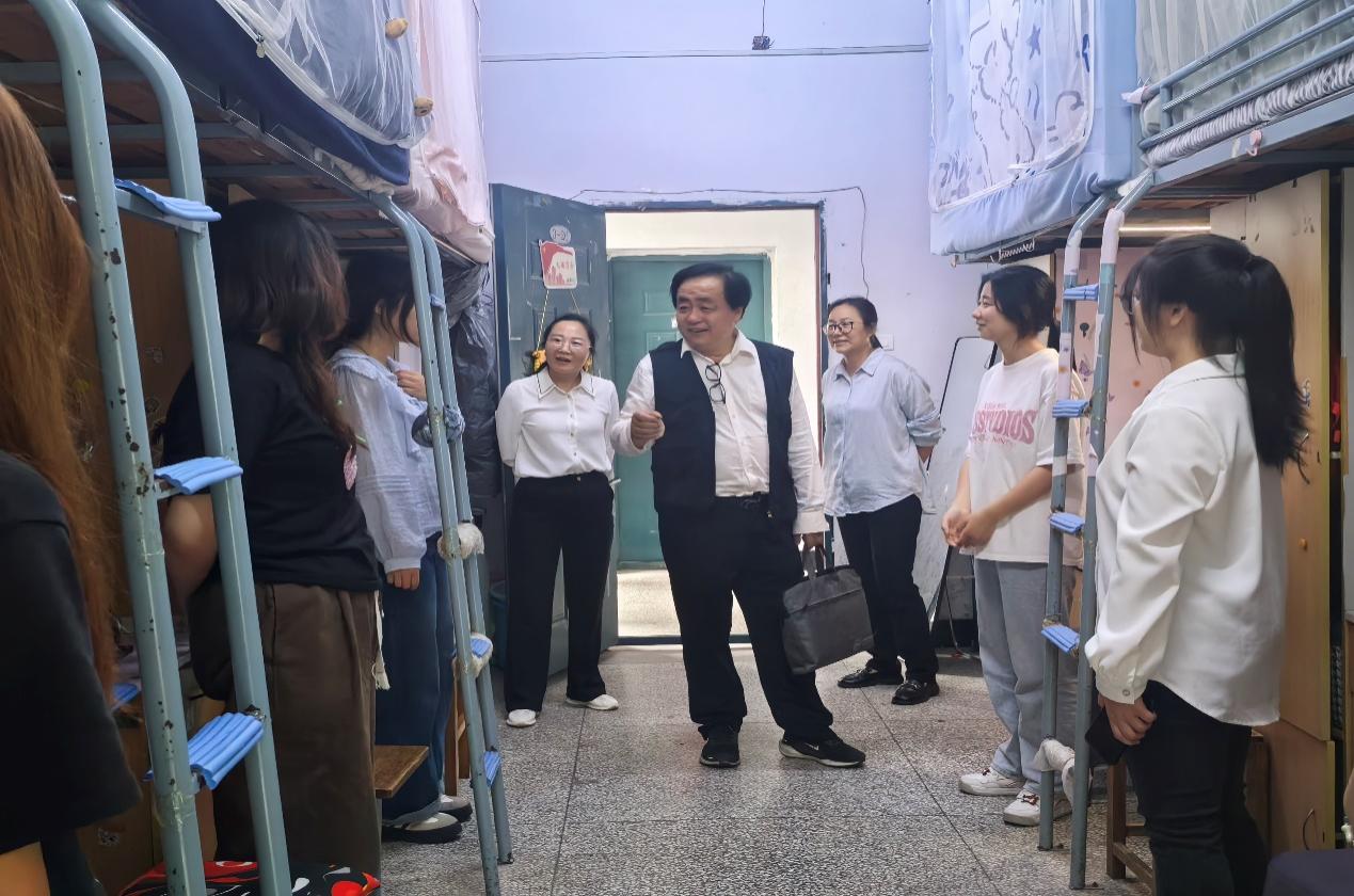 梁学军首先来到光华社区,看望社区工作的辅导员,深入调研社区建设和工作开展情况。随后他走进学生寝室,详细了解学生日常学习与生活细节。当看到整齐干净的宿舍和同学们积极向上的精神风貌,他对光华社区的工作进行了表扬和肯定。