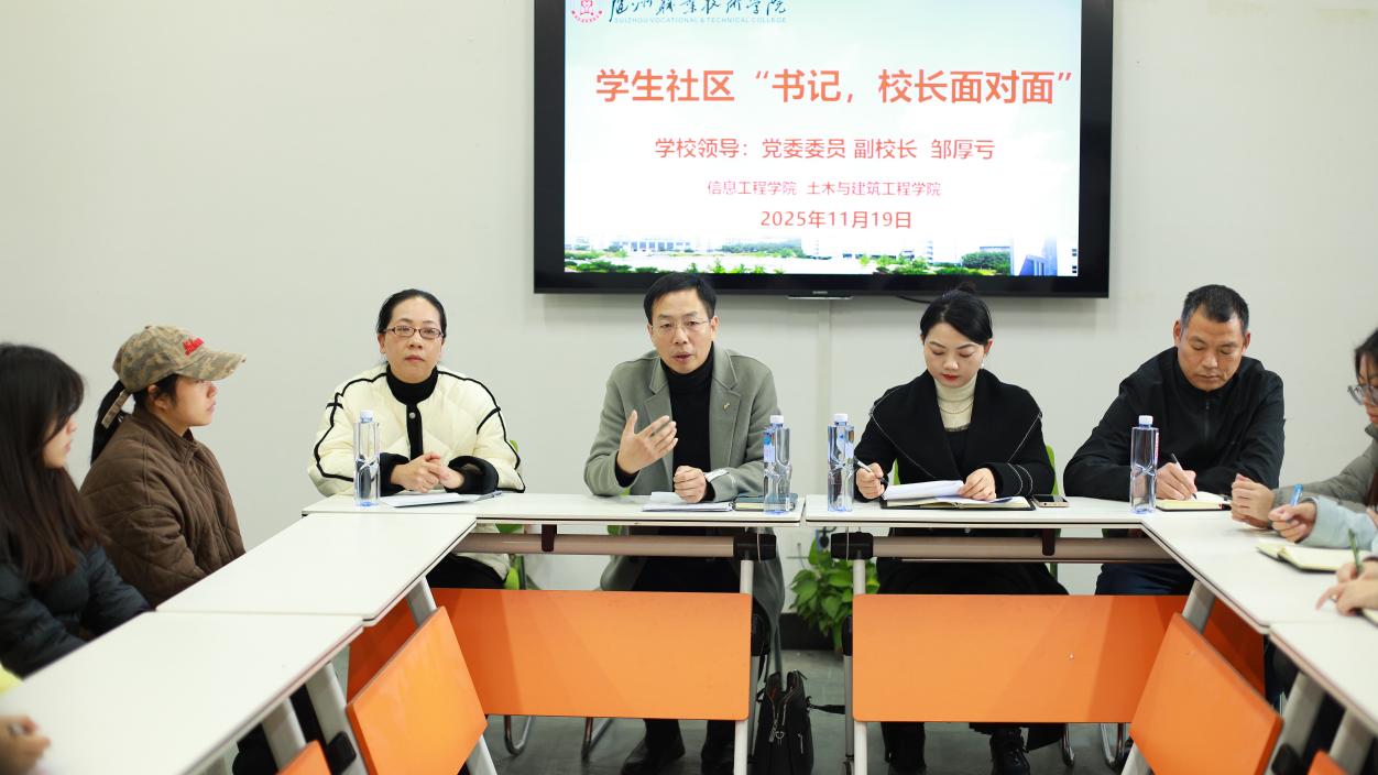 11月19日,学生社区“书记、校长面对面”系列活动之职业发展指导活动在“一站式”学生社区驿站党团活动室举行。学校党委委员、副校长邹厚亏与来自土木与建筑工程学院、信息工程学院的三十余名学生代表齐聚一堂,围绕学业规划、职业发展与就业竞争力提升等话题开展深度交流。活动由信息工程学院党总支书记程蓉主持。