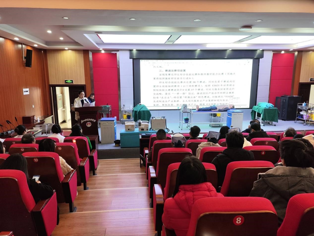 11月26日,bat365在学术报告厅召开2026年湖北省职业院校技能大赛备赛动员大会。党委委员、副校长梁学军出席会议。各二级学院党总支书记、院长、分管教学副院长、教学办主任、全体参赛指导教师与参赛学生,教务处全体人员参加会议。会议由教务处处长杨芳主持。