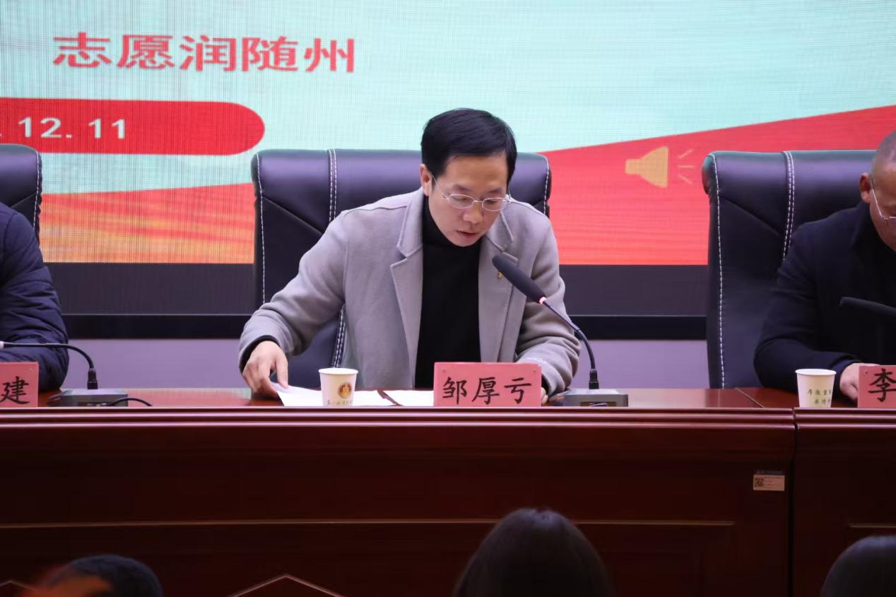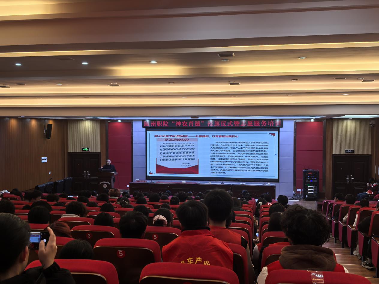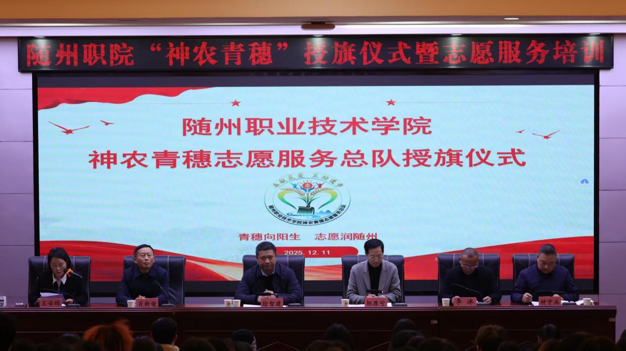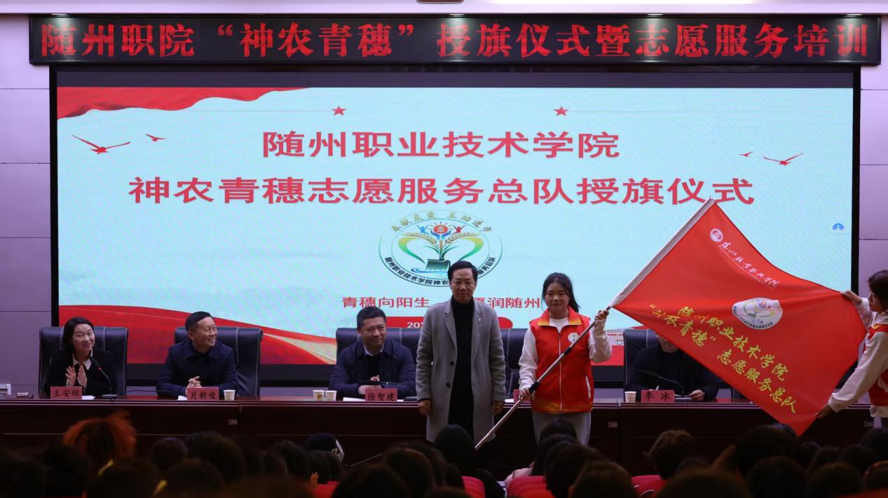12月11日,bat365中文官方网站在学术报告厅举行“神农青穗”志愿服务总队授旗仪式暨志愿服务能力提升培训。校党委委员、副校长邹厚亏,随州市委社会工作部四科科长徐智建,随州市志愿服务联合会会长李冰出席活动。学校党委宣传部、学生工作处、团委等部门负责人及各二级学院志愿服务队师生代表参加。