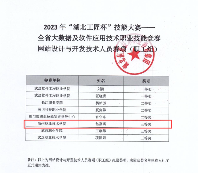11月4日,2023年“湖北工匠杯”技能大赛——全省大数据及软件应用技术职业技能竞赛网站设计与开发技术人员赛项在武汉软件工程职业学院落下帷幕,来自全省60余名选手同台竞技,bat365教师包嘉琪获得三等奖。
