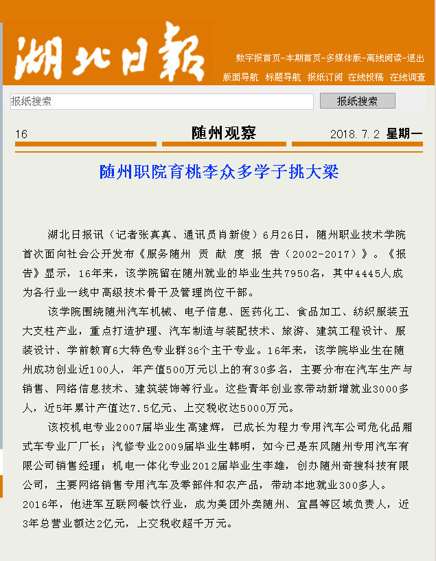 下一条:湖北教育新闻网:随州职院发布《服务随州贡献度报告(2002-2017)》