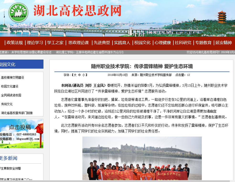 上一条:湖北教育新闻网:随州职院传承雷锋精神 共保生态环境