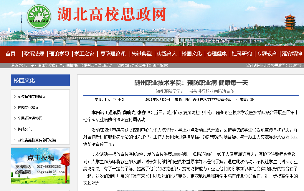 上一条:湖北教育新闻网:预防职业病 健康每一天