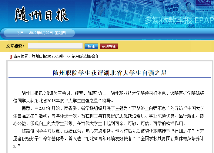 下一条:随州日报:随州职院学生获评湖北省大学生自强之星