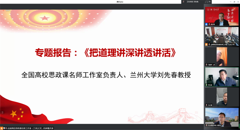5月15日,由教育部全国高校思政课刘先春名师工作室、兰州大学澳门网投唯一官网主办,天水师范学院澳门网投唯一官网、甘肃民族师范学院澳门网投唯一官网、陇南师范高等专科学校澳门网投唯一官网、兰州科技职业学院、菏泽学院澳门网投唯一官网、黔东南民族职业技术学院马列主义教研部参与组织的“学习贯彻习近平总书记考察中国人民大学重要讲话精神暨教育部全国高校思政课名师工作室(兰州大学-刘先春)2022年第一期集体备课会”召开,会议采取线下与线上相结合的方式进行,由兰州大学澳门网投唯一官网副院长杨志超主持。
