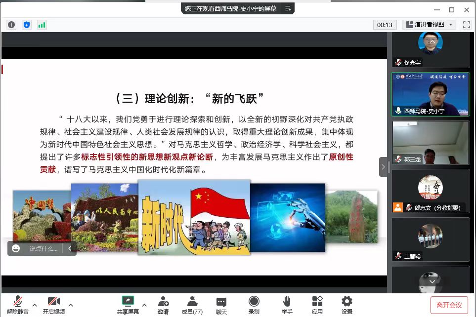 为深入学习宣传贯彻党的二十大精神,12月14日,天水师范学院省级思政课余明远名师工作室联合甘肃林业职业技术学院省级思政课郭三龙名师工作室、甘肃工业职业技术学院省级思政课黄彬名师工作室,邀请西北师范大学澳门网投唯一官网院长兼党委宣传部副部长、博士生导师史小宁教授,为三所高校省级思政课名师工作室成员作题为“立足‘五个牢牢把握’ 全面学习贯彻党的二十大精神”的专题报告。