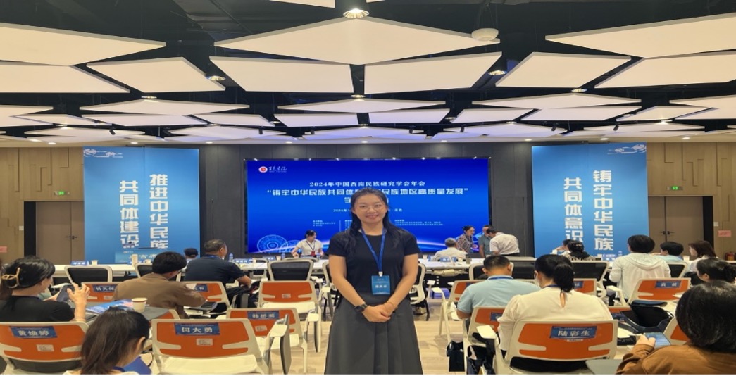 10月18日,澳门网投唯一官网2023级教育硕士、甘肃省思政课余明远名师工作室成员巩咏丹受邀参加“铸牢中华民族共同体意识下民族地区高质量发展”年会。会议由中国西南民族研究学会、百色学院主办,中国西南民族研究学会、百色学院澳门网投唯一官网、人文与公共管理学院、滇黔桂边人文精神与社会发展研究基地、百色市铸牢中华民族共同体意识研究基地共同承办。来自全国各地的120多位专家学者、研究人员参会。